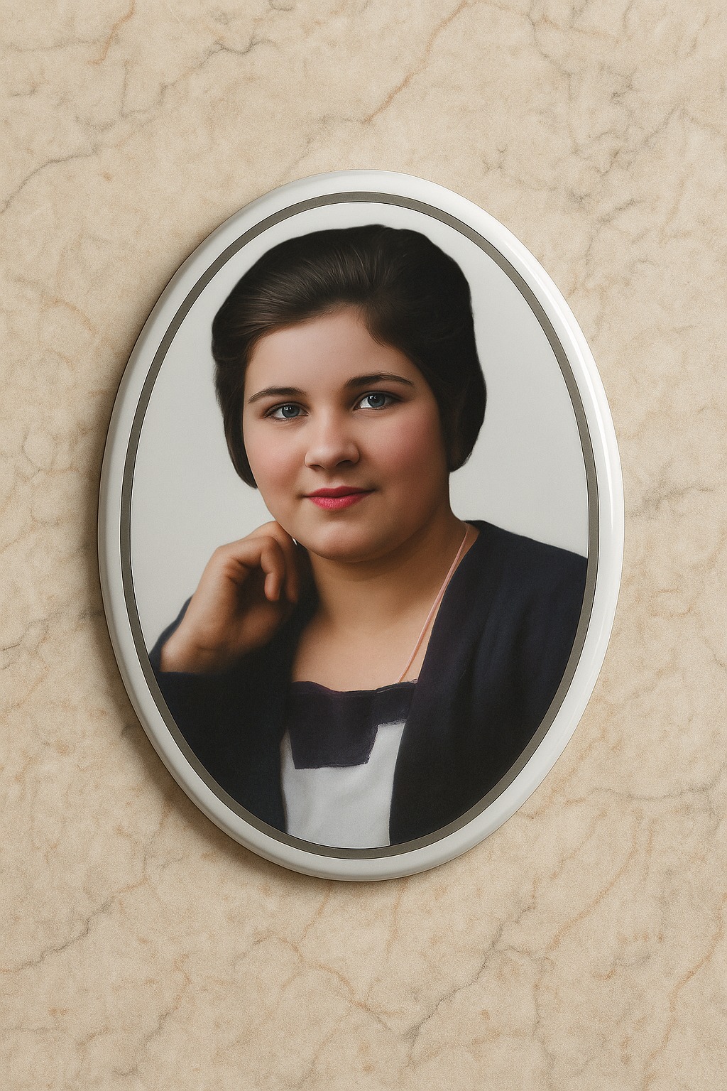 Fotoceramika nagrobkowa 7×9 cm, owalna, z platynowym paskiem, nadruk kolorowy. Odporna na warunki atmosferyczne, przeznaczona do zastosowań zewnętrznych.
