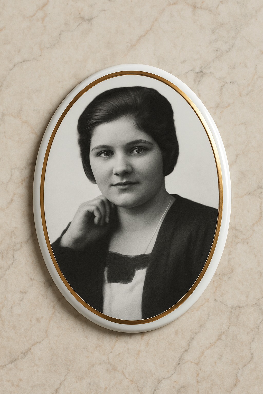 Fotoceramika nagrobkowa 8×11 cm, owalna, ze złotym paskiem, nadruk czarno-biały. Odporna na warunki atmosferyczne, przeznaczona do zastosowań zewnętrznych.
